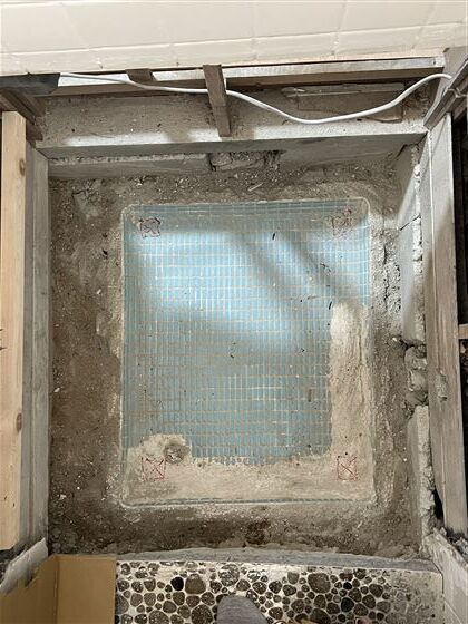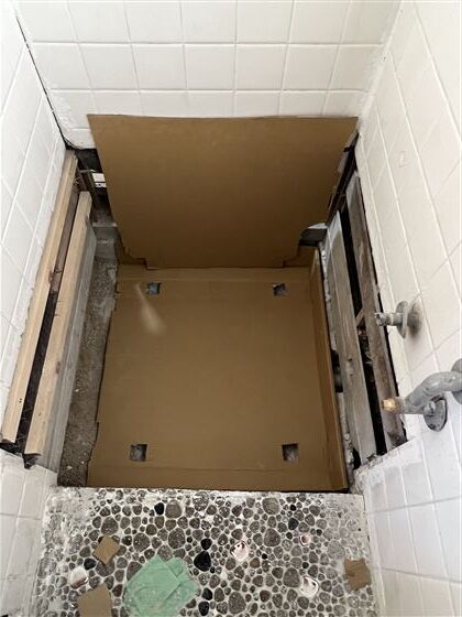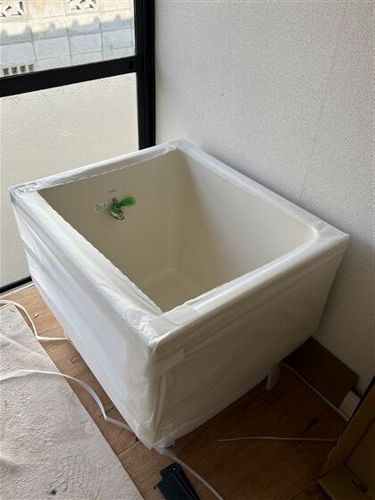取り付け足の位置に段ボールに穴御あけてタイル風呂の底に書き込んでみました