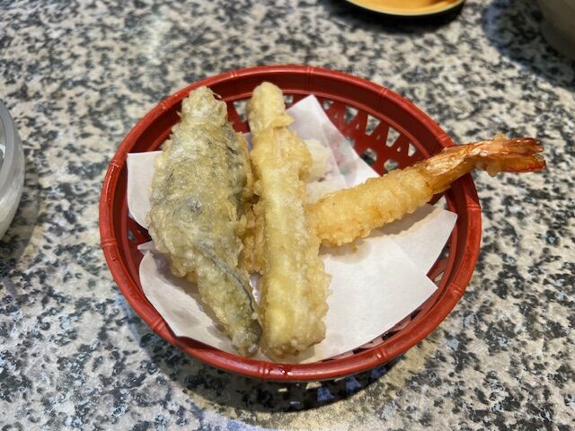 茄子、ゴボウと海老天 アツアツでとてもおいしかった