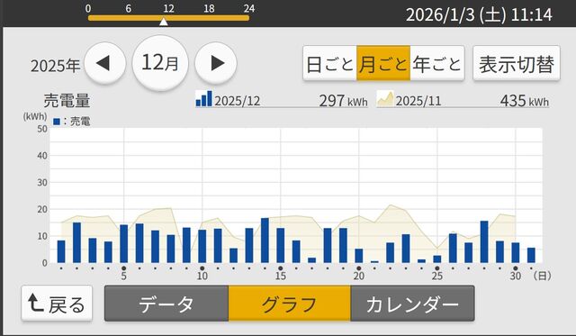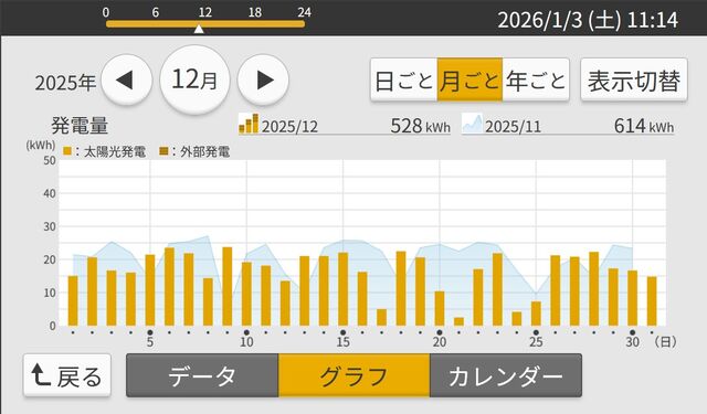 12月発電実績 528kWh 11月614kWh 85.99%