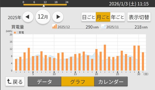 12月買電量 290kWh 11月度 218kWh 133.03%
